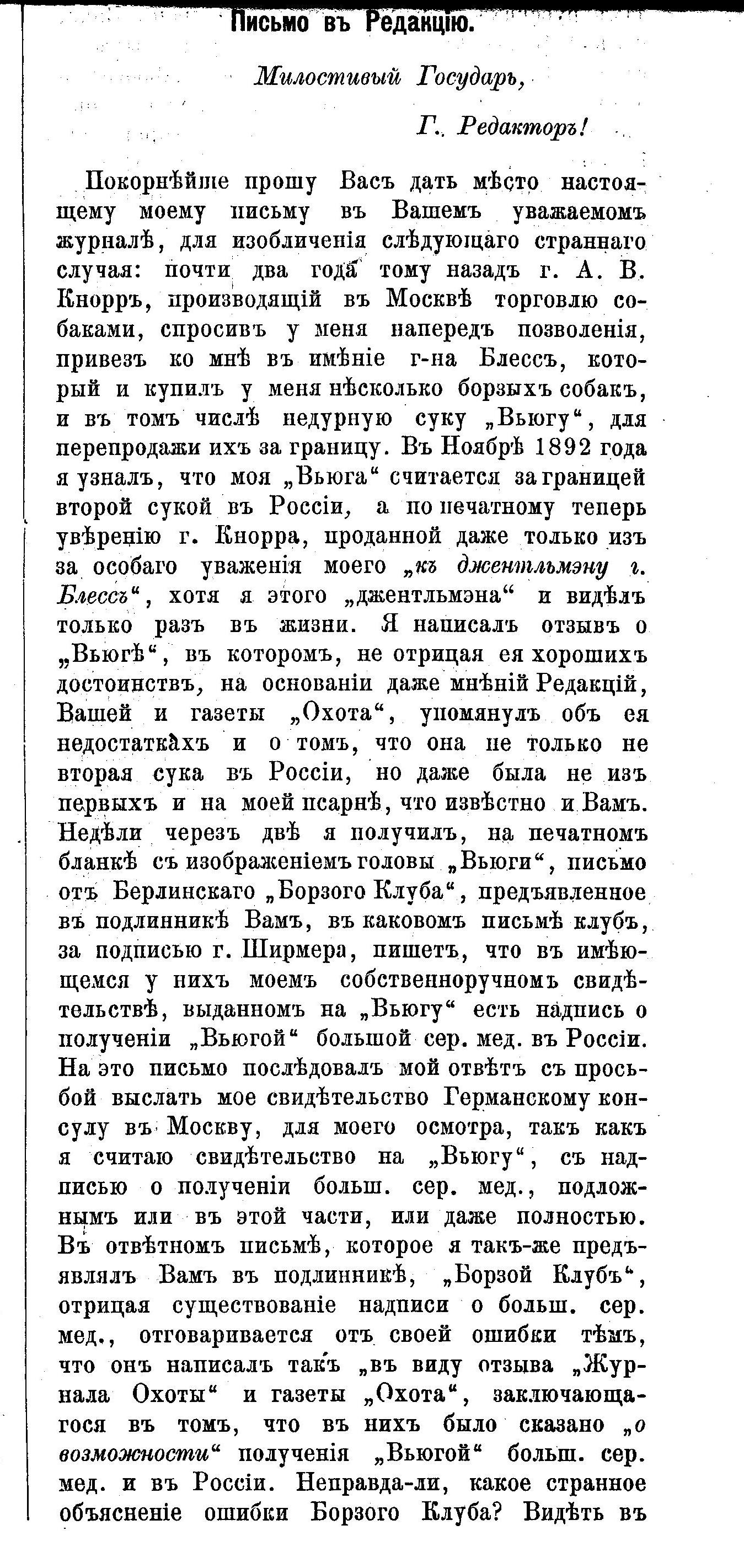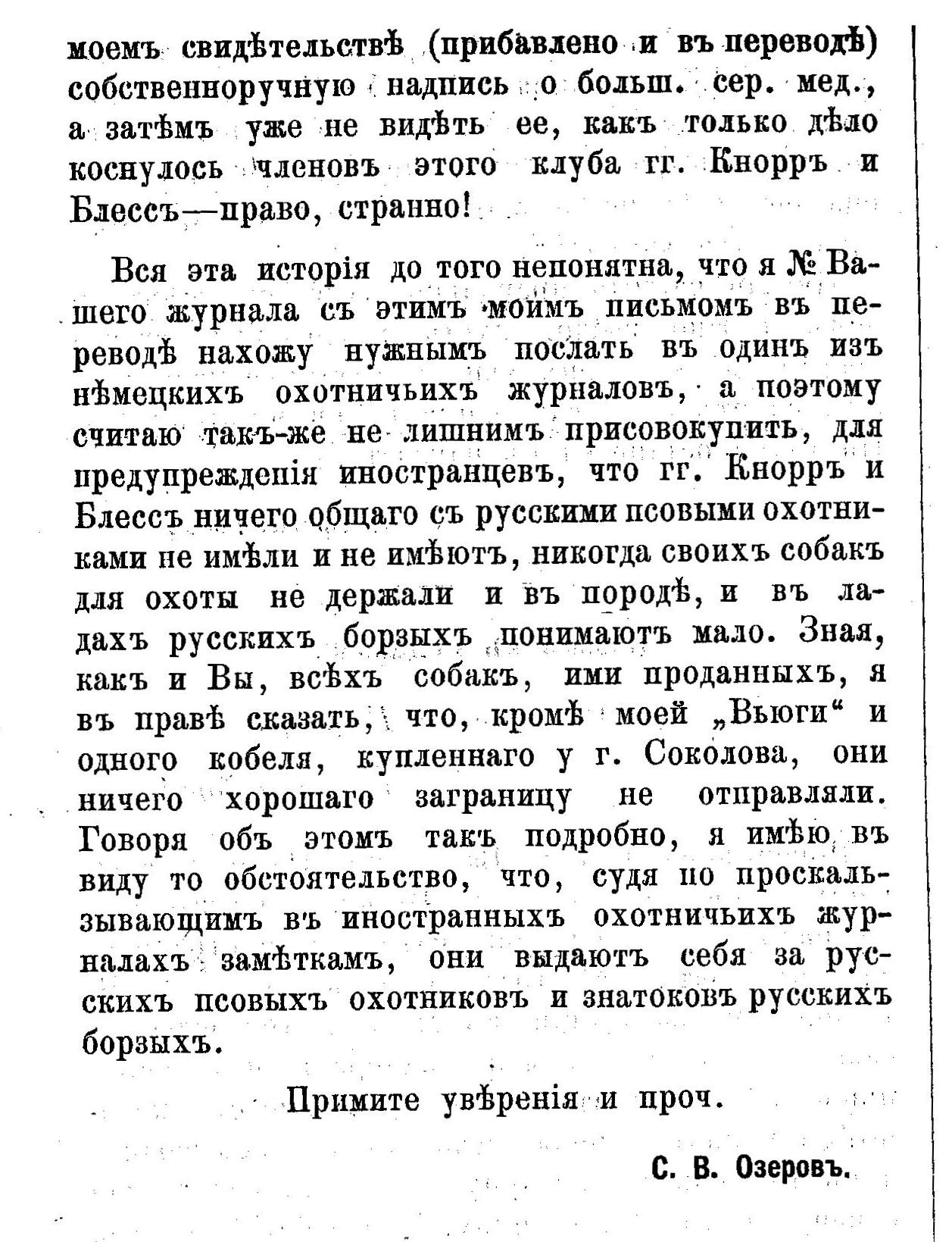 Озеров С.В. . Письмо в "Дневник Охотника". 1893 г.