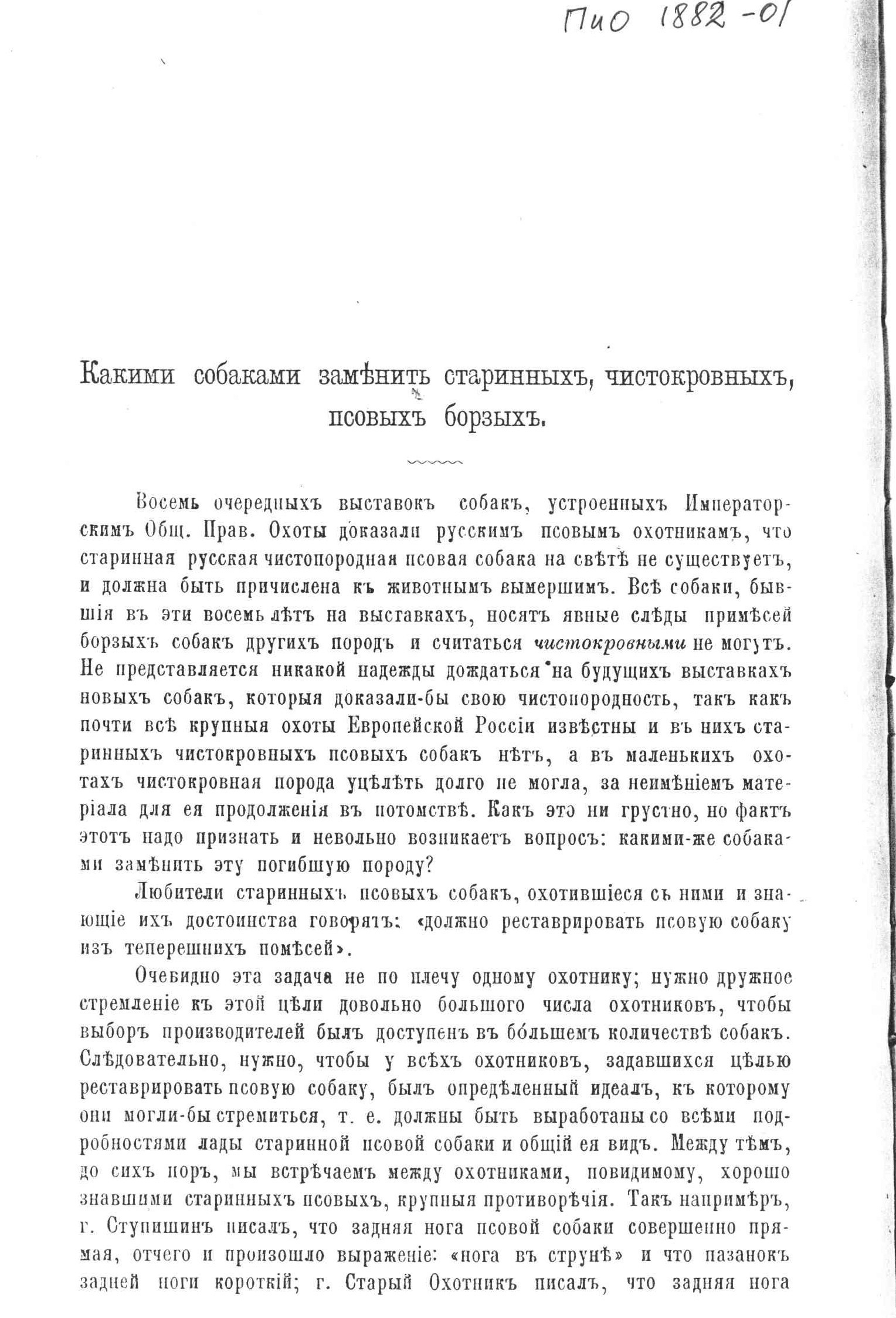 Вальцов Д.П. "Какими собаками заменить старинных, чистокровных псовых борзых." 1882г.